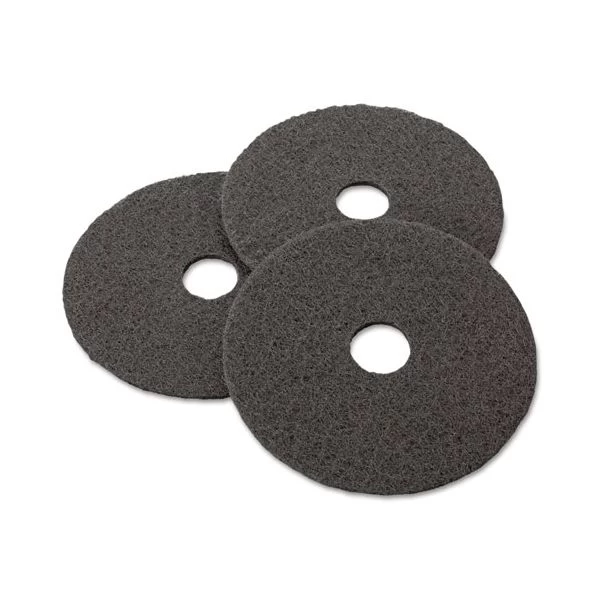 3M Low-Speed Stripper Floor Pad 7200, 17″ Diameter, Black, 5/Carton – Stripping pads remove all finish, sealer and contaminants from the floor surface. Use with water-based, floor-finish stripping solutions to remove old, soiled floor finishes and sealers at the start of a maintenance program and at times when scrubbing will not achieve the desired result. The Black Stripper Pad 7200 is also used to clean heavily soiled, hard surface floors, such as concrete, with appropriate cleaning chemicals. 17 diameter pads are designed for use in rotary or automatic equipment on low speeds from 175 to 600 RPM. Stripping pads quickly and thoroughly remove old finish, dirt and buildup. Each pad is made of nylon and polyester fibers in an open textured nonwoven construction. Abrasive particles are dispersed throughout and bonded to the nonwoven construction with a durable adhesive.”
