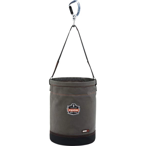 Arsenal 5940 Swiveling Carabiner Canvas Hoist Bucket – 5940 Hoist Bucket with Swiveling Carabiner hoists tools and equipment while working at heights, including construction, telecom and more. To hold 150 Ib. without strain, webbing handle features leather reinforcement that contributes to high tensile strength. Double-action swiveling carabiner lets bucket sway without tangling the handle. Captive eye mechanism provides lock support so the bucket will not cause tension to handle or carabiner. Bucket’s main material is made of durable, 24 oz. canvas. Synthetic leather-reinforced base protects hoist bucket from wear and tear. Plastic-molded top ring provides in/out access to look inside and grab equipment. Patented, nickel-plated, storm drain increases ventilation. Interior pocket supplies separate compartment for organization.