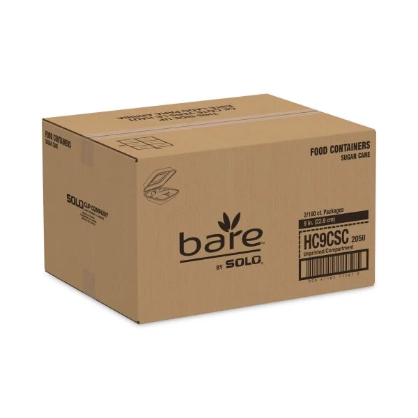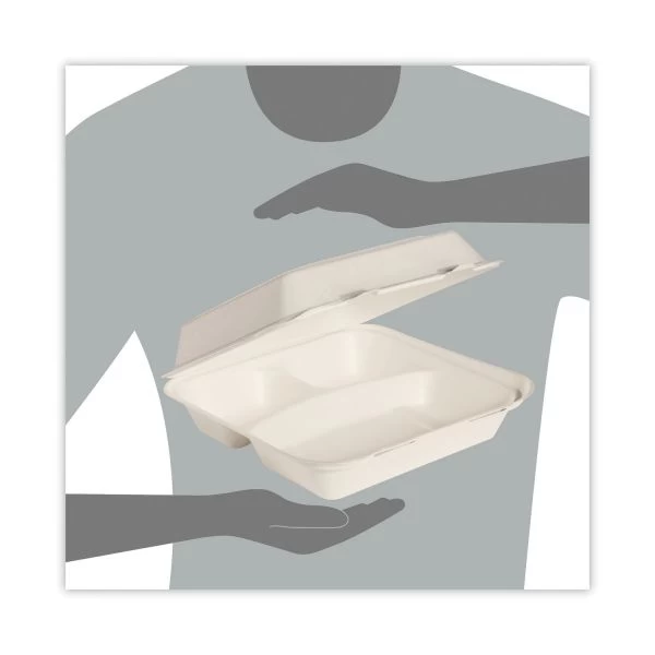 Bare Eco-Forward Bagasse Hinged Lid Containers, 3-Compartment, 9.6 x 9.4 x 3.2, Ivory, Sugarcane, 200/Carton – Eco-Forward with an upscale quality.These Bare by SOLO hinged lid containers have excellent rigidity and soak-through resistance that will stand up to the rigor of heavy and saucy foods.The lock tab design ensures easy, secure closure in one motion for operator ease.These hinged containers also feature a nesting design for secure stacking.Not suitable for backyard composting.Meets the ASTM standard D6868 for Commercial Compostability.Made with at least 96% plant-based renewable resources