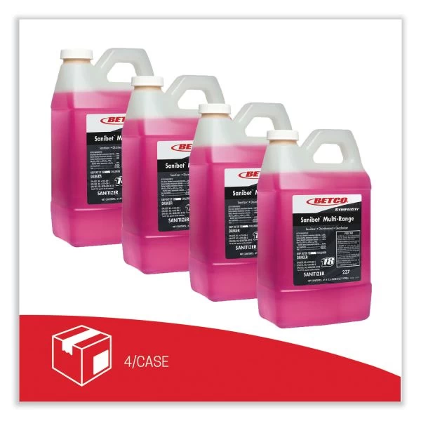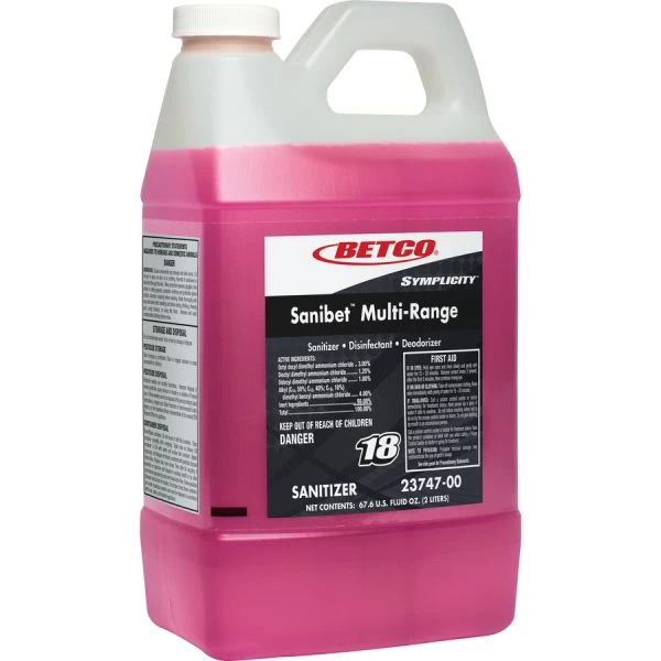 Betco Symplicity Sanibet Multi-Range Sanitizer – FASTDRAW 18 – EPA-approved, broad-range sanitizer delivers correct sanitizing at a range of 150 to 400 ppm. That allows the sanitizing solution to adapt to varying water-pressure situations while maintaining compliance with health department regulations. Multi-Range Sanibet kills 99.99 percent of foodservice organisms (listeria, E. coli and salmonella). It can be used to sanitize serving ware, utensils, pots and pans, and food-processing equipment. It can also be used for disinfecting floors and walls. This complete, chemically balanced deodorizer/disinfectant/sanitizer is effective even in the presence of hard water. As part of the FastDraw system, the highly concentrated sanitizer in a spill-proof bottle is numbered (FastDraw 18) and color-coded to eliminate misuse. Metering insert reduces end-use cost per gallon by delivering accurate dilutions.