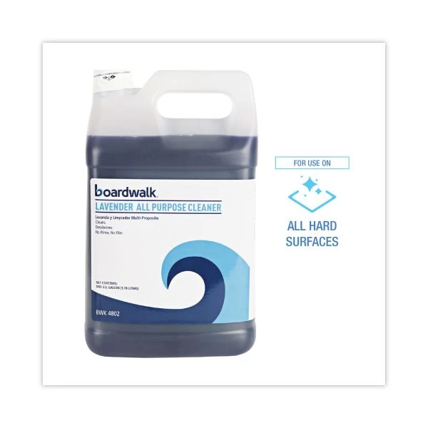 Boardwalk All Purpose Cleaner, Lavender Scent, 1 gal Bottle – A deodorizing, neutral, all-purpose cleaner recommended for cleaning all hard surfaces, including floors, walls, restroom surfaces, and other areas where daily cleaning is performed. The non-filming product requires no rinse, allowing for quick and easy cleaning. For use on a variety of materials, such as chrome, Formica, porcelain, granite, marble, mirrors, plastic, and stainless steel. Deodorizes with a pleasant, lingering lavender fragrance. Recommended dilution: normal (1:128).
