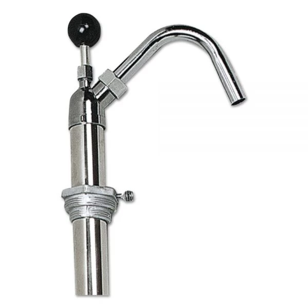 Boardwalk Bottle Pump, 22 oz/Pump, Steel, 42.5″ Tall, Chrome, 6/Carton – Corrosion-resistant chrome plating protects metal from the corrosive effects of water-based solutions. One size fits most standard 15, 30, and 55 gallon drums. Large 22 oz. output per stroke significantly reduces the number of times you pump, resulting in less hand fatigue. Broadly applicable pump is usable with a wide variety of solutions, including water-based solutions and solvents. Durable pump is ideal for thicker liquids, like motor oil. Do not use with corrosive chemicals. Teflon® coated packing seal increases chemical resistance.