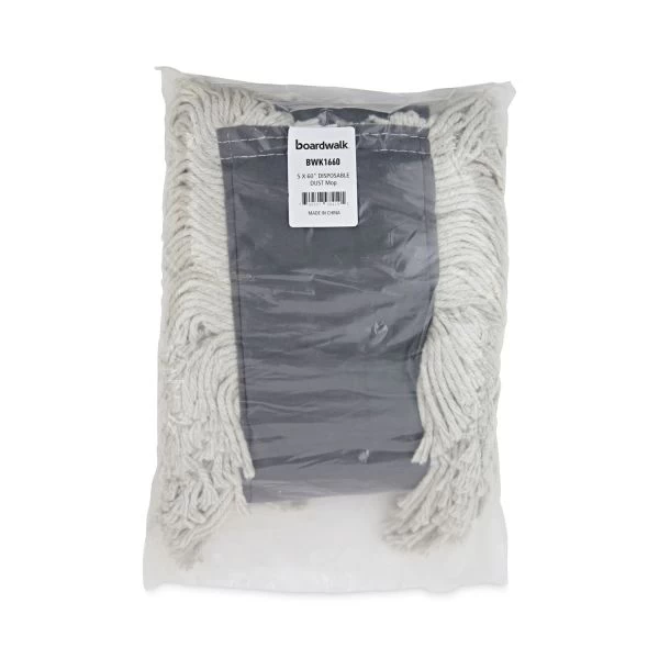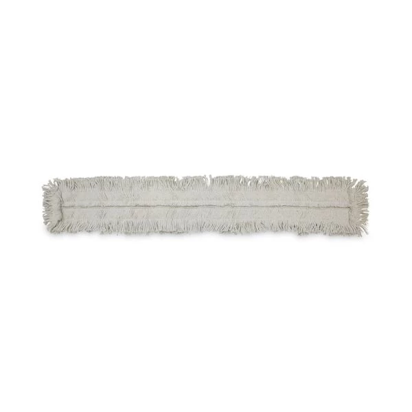 Boardwalk Disposable Dust Mop Head, Cotton, Cut-End, 60w x 5d – Four-ply, pretreated yarn, dust mop head. Equipped with a slot pocket backing which allows a metal dust mop frame to slide into its place quickly and easily. Sewn center fringe for added coverage and durability. The disposable head can be discarded when dirty. Ideal for use on floors that require dusting, with or without cleaning spray. Handle and frame are sold separately.