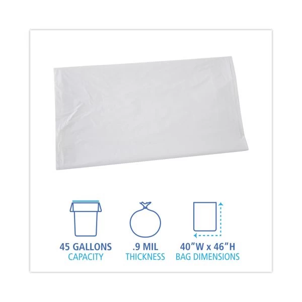 Boardwalk Linear Low Density Industrial Can Liners, 45 gal, 0.9 mil, 40 x 46, White, 100/Carton – Linear, low-density polyethylene provides industrial strength performance. Puncture and tear resistance for added durability. Sturdy, star-seal bottom helps prevent leaks and keep heavier loads inside the bag. Individually folded for quick and easy dispensing. A quality can liner that provides trusted waste collection at an economical price. Individually folded in carton for quick and easy dispensing.
