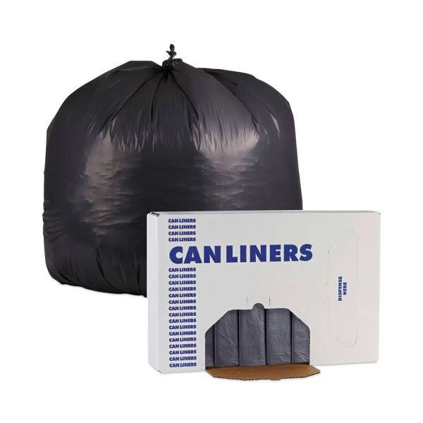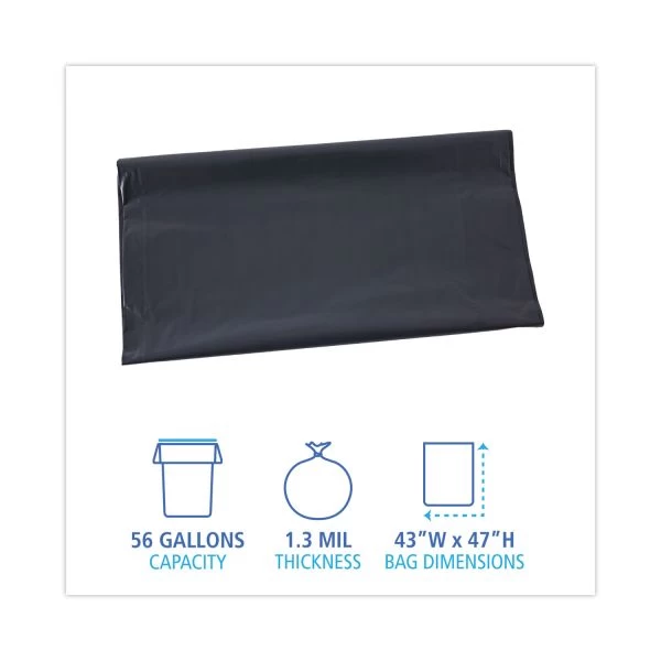 Boardwalk Linear Low Density Industrial Can Liners, 56 gal, 1.3 mil, 43 x 47, Gray, 100/Carton – Linear, low-density polyethylene provides industrial strength performance. Puncture and tear resistance for added durability. Sturdy, star-seal bottom helps prevent leaks and keep heavier loads inside the bag. Individually folded for quick and easy dispensing. A quality can liner that provides trusted waste collection at an economical price. Individually folded in carton for quick and easy dispensing.