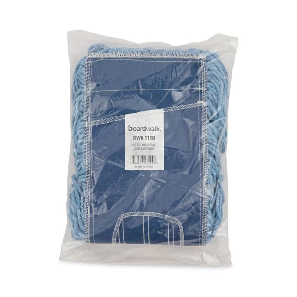 Boardwalk Mop Head, Dust, Looped-End, Cotton/Synthetic Fibers, 18 x 5, Blue – This dust mop head is sturdy and made from a four-ply cotton/synthetic blend. It has looped ends as well as reinforced backing ends and stress points for extra durability. Washable and reusable for added value and less waste. It is easy to use with a slot top/clip-on closure. Ideal for use on delicate, hard surfaces such as hardwood, laminate, tile, and marble. Frame and handle are sold separately.