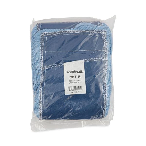 Boardwalk Mop Head, Dust, Looped-End, Cotton/Synthetic Fibers, 24 x 5, Blue – This dust mop head is sturdy and made from a four-ply cotton/synthetic blend. It has looped ends as well as reinforced backing ends and stress points for extra durability. Washable and reusable for added value and less waste. It is easy to use with a slot top/clip-on closure. Ideal for use on delicate, hard surfaces such as hardwood, laminate, tile, and marble. Frame and handle are sold separately.
