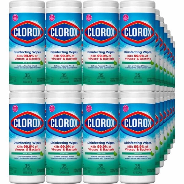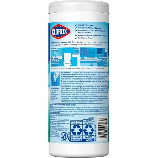 Clorox Disinfecting Cleaning Wipes – Clorox Disinfecting Wipes clean, disinfect, deodorize and remove allergens for five times the cleaning power and leave behind a pleasant, fresh scent. Wipes clean and disinfect with antibacterial power that kills 99.9 percent of viruses and bacteria that can live on hard, nonporous surfaces, including COVID-19 Virus, staph, E. coli, MRSA, salmonella, strep and Kleb. These all-purpose, disposable wipes remove common allergens, germs and messes on surfaces like kitchen counters, bathroom surfaces and more and can prevent the growth of odor-causing bacteria on nonfood-contact surfaces for up to 24 hours. Wipes are safe to use on finished wood, sealed granite and stainless steel. Clean with bleach-free wipes to keep dirt and germs away. Use as directed and allow surfaces to air-dry.