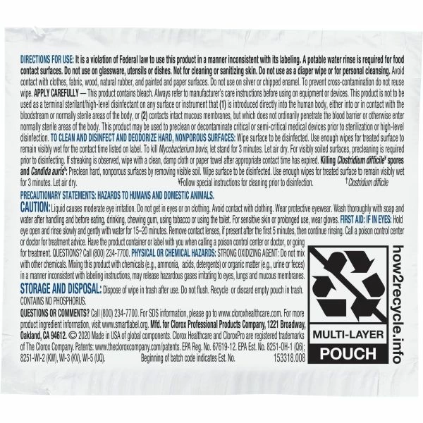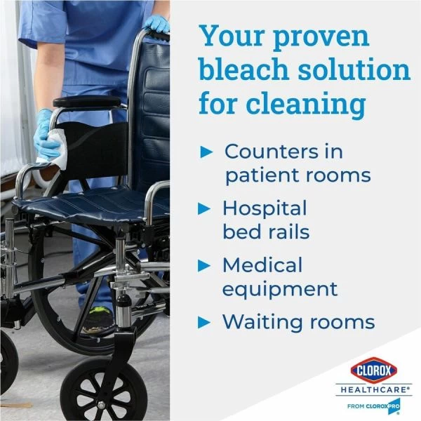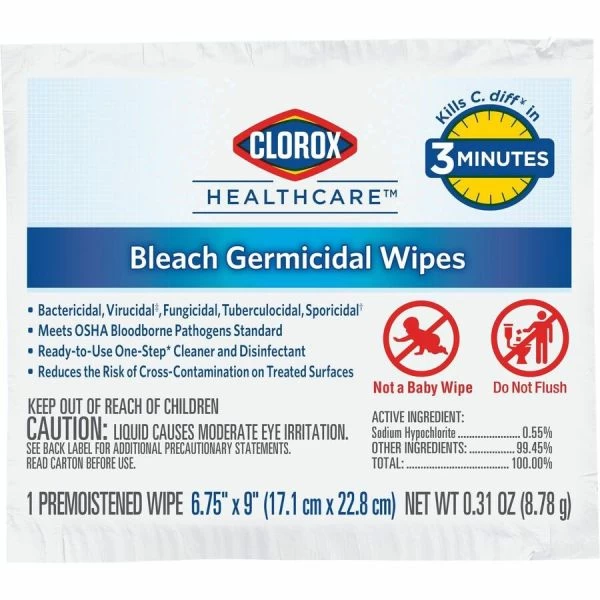 Clorox Healthcare Bleach Germicidal Wipes – Clorox Healthcare Bleach Germicidal Wipes are ready-to-use, one-step cleaner containing a 1:10 bleach dilution to meet CDC and OSHA guidelines for disinfecting surfaces in healthcare settings. Designed for discharge disinfection, large areas. These terminal wipes are EPA-registered to kill a total of 58 microorganisms, including HAI-causing bacteria like MRSA and VRE in 30 seconds, outbreak-causing viruses such as Influenza A and B viruses, Measles Virus and Norovirus in 1 minute and C. difficile spores, TB and fungi in 3 minutes. They meet EPA criteria for use against SARS-CoV-2, the virus that causes COVID-19. These wipes are engineered minimize residue and leave less visible residue on surfaces vs. competitor bleach wipes. Wipes are formulated with an anticorrosion agent and are compatible with common healthcare surfaces including stainless steel, glass, plastic, porcelain, glazed ceramic, laminated surfaces and vinyl. They are intended for use in healthcare settings.