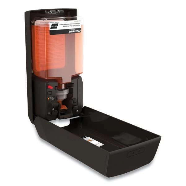 Coastwide Professional J-Series Automatic Hand Soap Dispenser, 1,200 mL, 6.02 x 4 x 11.98, Black – Make handwashing simple with this hands-free electronic soap dispenser. Adjustable output helps control consumption of J-Series foam soap to prevent waste and the color-coded interior touchpoints make it easy for staff to refill. Clear window in the front helps to easily view how much soap is left. Works on four C batteries (batteries included). Back up dispensing push light illuminates when batteries are depleted. Comes with two options for mounting. Mounting screws are included for drill option and two-sided label is also included to mount on mirrors or glass. Universal key works with all dispensers in the J-Series so janitors only need to carry one key around.