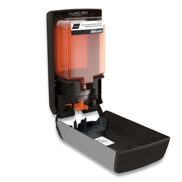 Coastwide Professional J Series Manual Hand Soap Dispenser, 1,200 mL, 6.02 x 4.01 x 11.59, Black/Metallic – Improve workplace hygiene and lower the risk of cross-contamination with this Coastwide Professional J-Series manual soap dispenser. Engineered to work with J Series foam soap refills (not included). Clear window in the front helps you easily view how much soap is left. Comes with two options for mounting; Mounting screws are included for drill option, and two-sided label is also included to mount on mirrors or glass. Universal key works with all dispensers in the J-Series so janitors only need to carry one key around. Intuitive, color-coded components for easy replenishment.