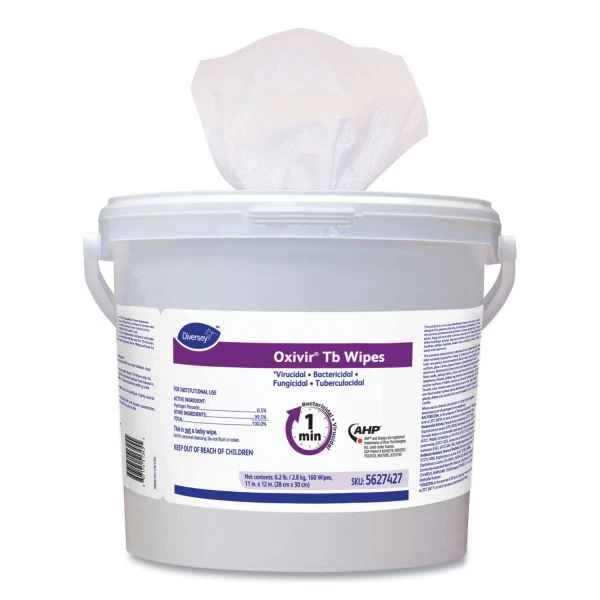 Diversey Oxivir TB Disinfectant Wipes, 11 x 12, White, 160/Bucket, 4 Buckets/Carton – Ready-to-use disinfectant cleaner wipe based on proprietary hydrogen peroxide (AHP®) technology to deliver fast, effective cleaning performance. Disinfects in 60 seconds. Virucide, bactericide, tuberculocide, fungicide and non-food contact sanitizer. Kills MRSA and Norovirus. Meets bloodborne pathogen standards for decontaminating blood and body fluids. No VOCs and no fragrance added. Non-irritating to skin and eyes.