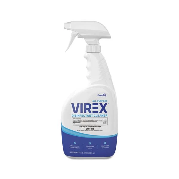 Diversey Virex All-Purpose Disinfectant Cleaner, Citrus Scent, 32 oz Spray Bottle, 8/Carton – A ready-to-use, quaternary-based, hospital-grade disinfectant that provides excellent cleaning and deodorizing in one step. Disinfects in three minutes. Bactericide, tuberculocide, virucide and fungicide. Kills Norovirus, VRE and MRSA. For use on hard, inanimate, non-porous surfaces such as floors, walls, porcelain and plastic. This product has demonstrated effectiveness against SARS-CoV-2 (the Novel Coronavirus that causes COVID-19) on hard non-porous surfaces in just 1 minute.
