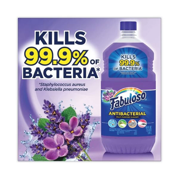 Fabuloso Antibacterial Multi-Purpose Cleaner, Lavender Scent, 169 oz Bottle, 3/Carton – Multi-Purpose Antibacterial Cleaner leaves a fresh scent that lasts. Packaged in a convenient, easy-pour bottle, this cleaner is easy to use, leaving no visible residue, so there is no need to rinse.