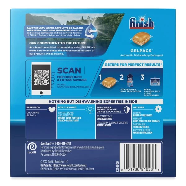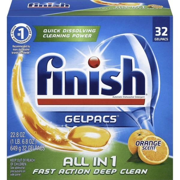 FINISH Dish Detergent Gelpacs, Orange Scent, Box of 32 Gelpacs, 8 Boxes/Carton – 100% concentrated gel that gives dishes a deep clean. Pre-Soakers burst into action to scrub away tough food residues like baked-on lasagna and dried-on oatmeal. Gelpacs are easy-to-use. The pre-measured pods have a refreshing orange scent that are safe for septic systems. Leave dishes and glasses sparkling clean.