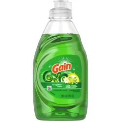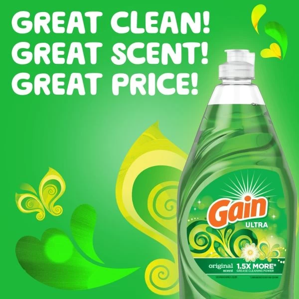Gain Gain Ultra Original Scent Dishwashing Liquid – Original dishwashing liquid features the great scent of Gain to refresh your senses with a crisp, clean smell. Advanced grease-fighting formula quickly powers away stuck-on foods for effortless cleanings. Clean-rinsing ingredients wash away completely with warm water to prevent leaving anything but a sparkling shine. The unique bottle is shaped with easy-to-grip grooves to easily dispense as much or as little as you need.