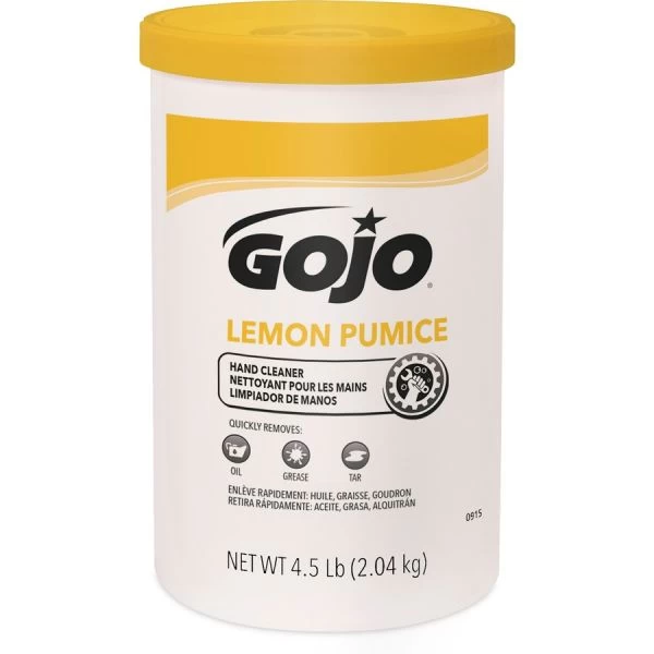 Gojo Lemon Pumice Hand Cleaner – Lemon Pumice Hand Cleaner contains pumice scrubbers to help loosen dirt. This waterless, hand cleaner cream is effective on grease, tar, oil and asphalt. It cleans with or without water. Lemon-scented hand cleaner contains no harsh solvents. It is not compatible the GOJO creme dispensers.