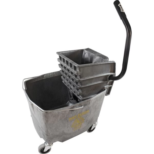Impact Products 35 QT Side Press Mop Bucket Wringer Combo – Side-press wringer and bucket combo features a durable polyethylene bucket and wringer that resists corrosion for reliable, long-lasting use with all of your cleaning solutions. Reinforced nylon bearings allow you to effortlessly control the steel handle for smooth operation. Single-bail design allows you to easily lift heavy loads. Inboard casters roll smoothly across floors for effortless mobility. Splash guard vents prevent the wringer water from escaping to help you maintain sanitary conditions.