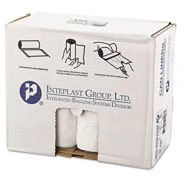 Inteplast Group Low-Density Commercial Can Liners, 30 gal, 0.8 mil, 30″ x 36″, White, 25 Bags/Roll, 8 Rolls/Carton – Institutional linear low-density bags provide excellent resistance to punctures and tearing. Employs star sealed bottom for even weight distribution. Prime resins used for superior quality.