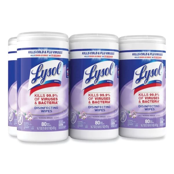 LYSOL Brand Disinfecting Wipes, 1-Ply, 7 x 7.25, Early Morning Breeze, White, 80 Wipes/Canister, 6 Canisters/Carton – Boost customer confidence with the recognizable canister of Lysol Disinfecting Wipes that’s ideal for high-visibility locations. Pre-moistened disinfecting wipes kill 99.9% of viruses and bacteria, including the virus that causes COVID-19 when used as directed on hard, non-porous surfaces. Hospital-type disinfection works on a variety of surfaces, including electronics. Quickly clean and disinfect high-touch germ hot spots to help protect your customers and staff. Clean up and keep moving with packaging that’s easy to open, dispense, and store.
