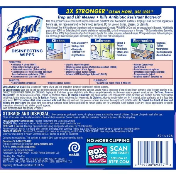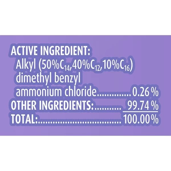 - Kills 99.9% of viruses and bacteria, including cold and flu viruses, Salmonella, E. Coli, MRSA, RSV, Staph, and Strep, when used as directed on hard, non-porous surfaces.