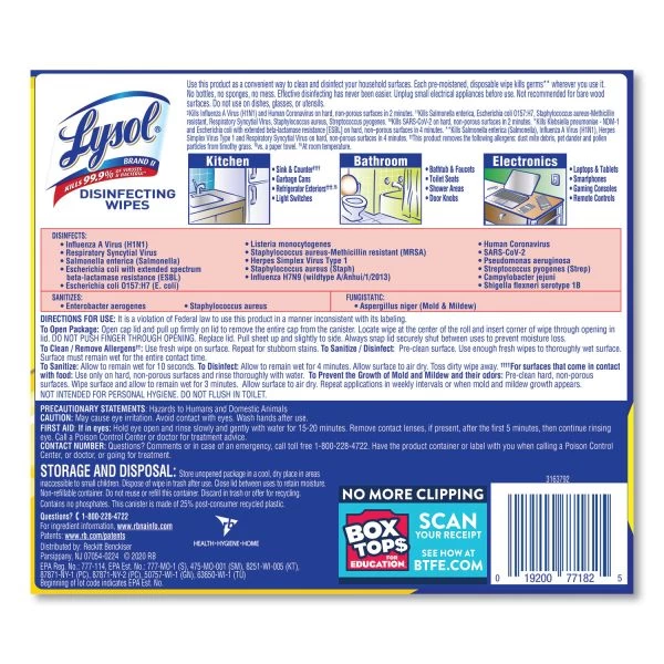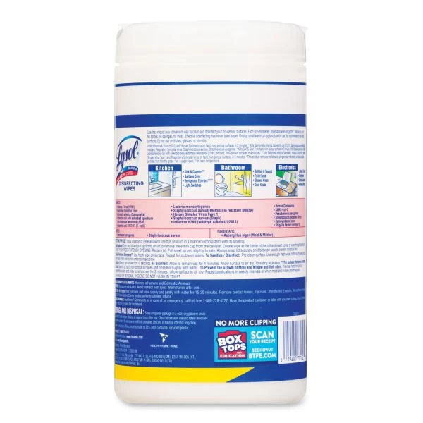 LYSOL Brand Disinfecting Wipes, 1-Ply, 7 x 7.25, Lemon and Lime Blossom, White, 80 Wipes/Canister, 6 Canisters/Carton – Tackle quick cleaning touch-ups and help stop the spread of germs with Lysol Disinfecting Wipes. Lysol disinfecting wipes kill 99.9 percent of viruses and bacteria on hard nonporous surfaces when used as directed. Lysol disinfecting wipes also remove more than 95% of allergens, including pet dander, dust mites, and pollen. Thick, pre-moistened wipes with a lemon/lime blossom scent are designed for use on kitchen counters, appliances, stovetops, cabinets, floors, garbage cans, toilet exteriors, bathtubs, sinks and more to clean, disinfect and deodorize. No bottle, no sponges, no mess. Airtight canister package keeps wipes moist and effective. Pop-up tub easily dispenses one Lysol wipe at a time.