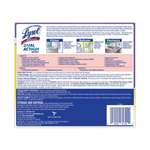 LYSOL Brand Dual Action Disinfecting Wipes, 1-Ply, 7 x 7.5, Citrus, White/Purple, 75/Canister, 6 Canisters/Carton – Boost customer confidence and take disinfection further with Lysol Disinfecting Wipes’ dual-sided texture that can both scrub and sanitize. Pre-moistened disinfecting wipes kill 99.9% of viruses and bacteria, including the virus that causes COVID-19 when used as directed on hard, non-porous surfaces. Hospital-type disinfection works on a variety of surfaces, including electronics. Quickly clean and disinfect high-touch germ hot spots to help protect your customers and staff. Clean up and keep moving with packaging that’s easy to open, dispense, and store.