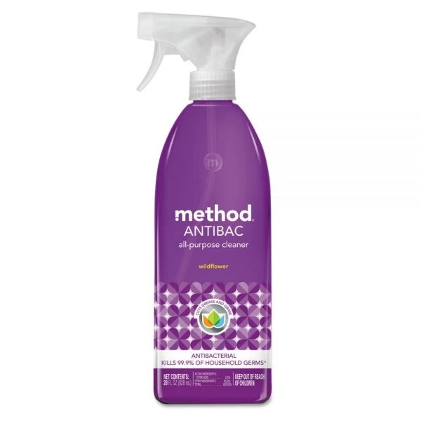 Method Antibac All-Purpose Cleaner, Wildflower, 28 oz Spray Bottle, 8/Carton – Tough antibacterial bathroom cleaner that eliminates dirt, germs and their accompanying odors. Kills 99.9% of household bacteria including influenza A flu virus, staphylococcus aureus, rhinovirus and salmonella enterica on hard, non-porous surfaces. Works as an antibacterial, antiviral, and antimicrobial. To disinfect, spray and let stand for 10 minutes, then wipe clean. Provides a thorough clean with the power of citric acid. Leaves behind a fresh scent.