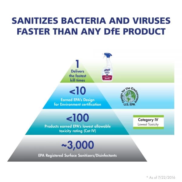 - No harsh chemicals, no precautionary statements, and no hand washing required after use; EPA Design for the Environment certified and fastest overall disinfection times of any DfE product