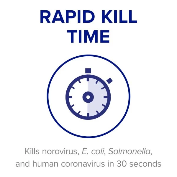 - Kills 99.9 percent of viruses and bacteria – including norovirus, E. coli, Salmonella, and human coronavirus in just 30 seconds