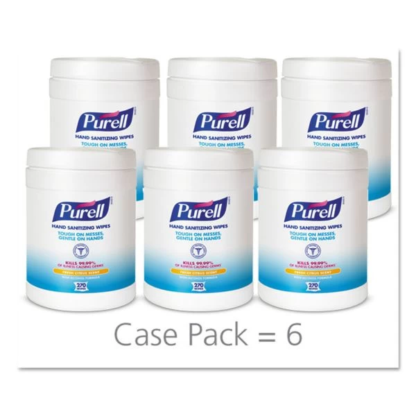 PURELL Sanitizing Hand Wipes, 6.75 x 6, Fresh Citrus, White, 270/Canister, 6 Canisters/Carton – Economical, hand wipes clean and sanitize. “On-the-go” amenity for use in food-service, healthcare, travel and hospitality industries. Made with 62% ethyl alcohol-the same active ingredient as PURELL Instant Hand Sanitizer.