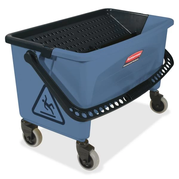 Rubbermaid Commercial Finish Mop Bucket w/ Wringer – Finish Bucket is designed especially for healthcare cleaning and comes in blue color because that is the color most associated with finish applications. Hinged lid with latches facilitates easy opening and closing. Lid is watertight. Bucket holds up to 20 microfiber wet pads, generally enough for one housekeeper for one shift using one pad per room. Washboard surface effectively removes dirt and debris from mop pads before wringing. Twist-valve empties contents without lifting. Ergonomic design means no bending or pulling. Bucket also features a molded-in filling guide. Molded-in grate prevents oversaturation. Smooth, nonporous surface helps prevent bacterial growth and cleans up easily. Bucket fits onto the Rubbermaid 6173 Janitor Cart and accommodates mopheads up to 18″ in width. Carry it with the convenient handle.
