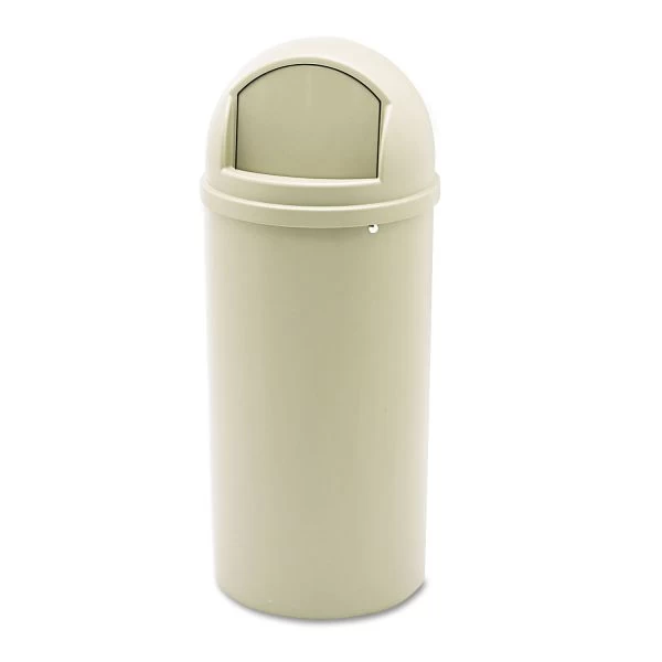Rubbermaid Commercial Marshal Classic Container, 15 gal, Plastic, Beige – Marshal Waste Container offers a generous 15 gallons of waste containment indoors or outdoors. Self-closing door meets fire marshal’s rigorous standards. One-piece construction includes a flip-top with a gravity closure door for sanitary protection. Permanent straps are designed for fastening liner bags. FM and CSFM approved.