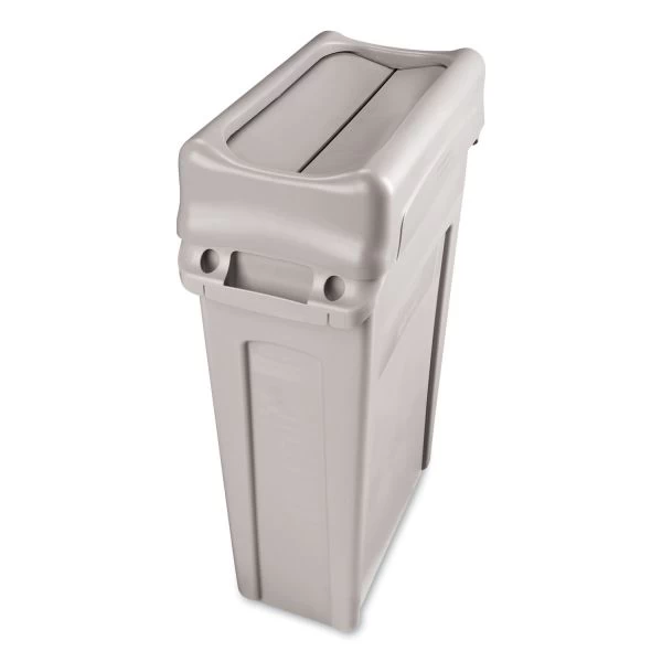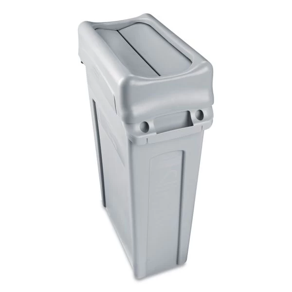 Rubbermaid Commercial Swing Lid for Slim Jim Waste Container, Gray – Top provides easy access for trash disposal, then swings back to hide refuse from view. Offers 61% more handsfree disposal area than earlier version.