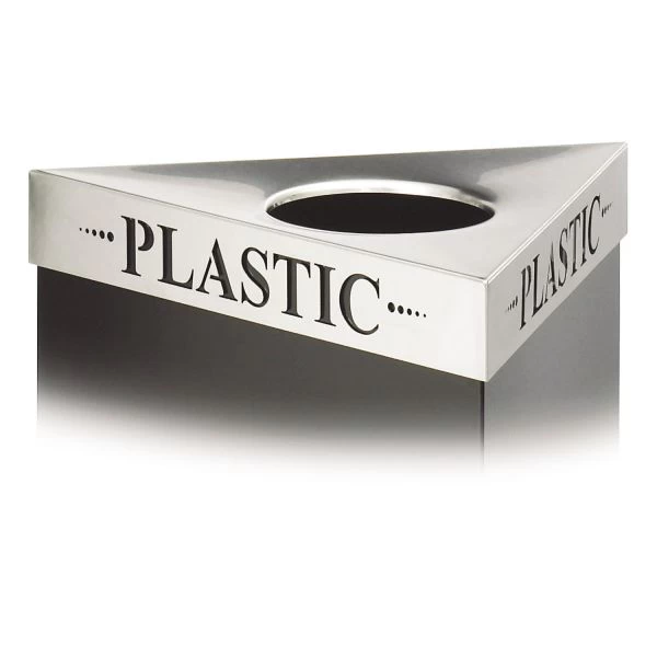 - Sleek, stainless steel triangular lid has laser-cut inscription to identify recyclables.