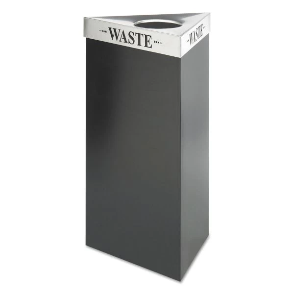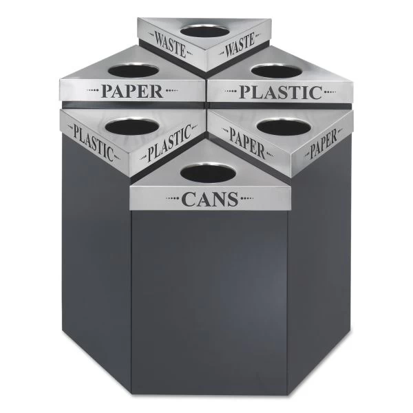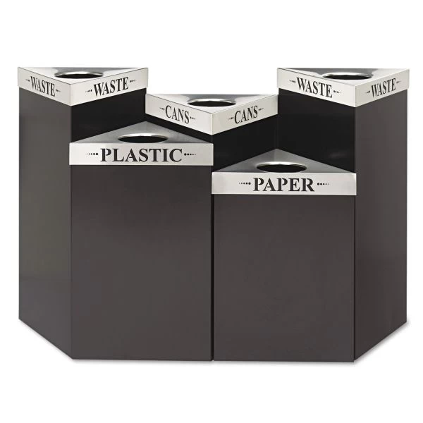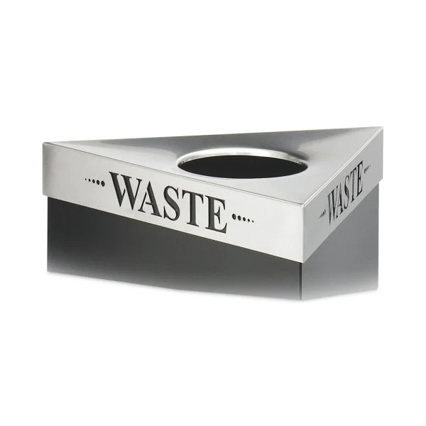Safco Triangular Lid – Sleek, stainless steel triangular lid has laser-cut inscription to identify recyclables. Part of Trifecta™ flexible design with four receptacles (sold separately), they offer a multitude of configurations to accommodate any workplace.