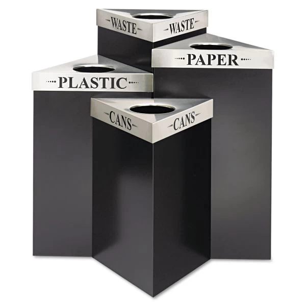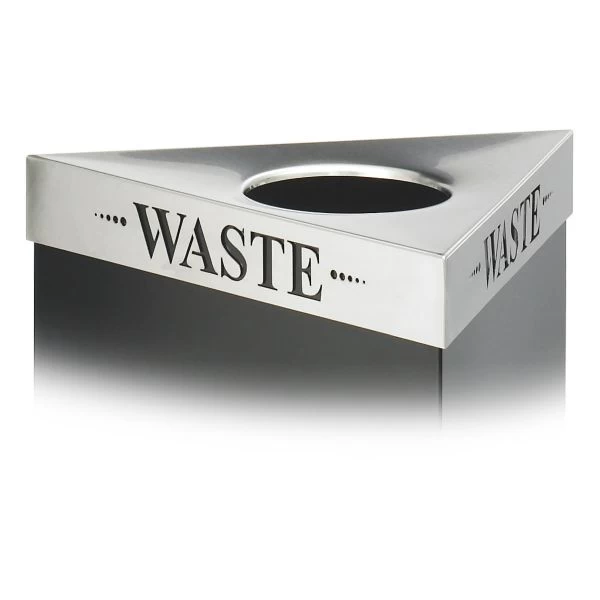 - Sleek, stainless steel triangular lid has laser-cut inscription to identify recyclables.