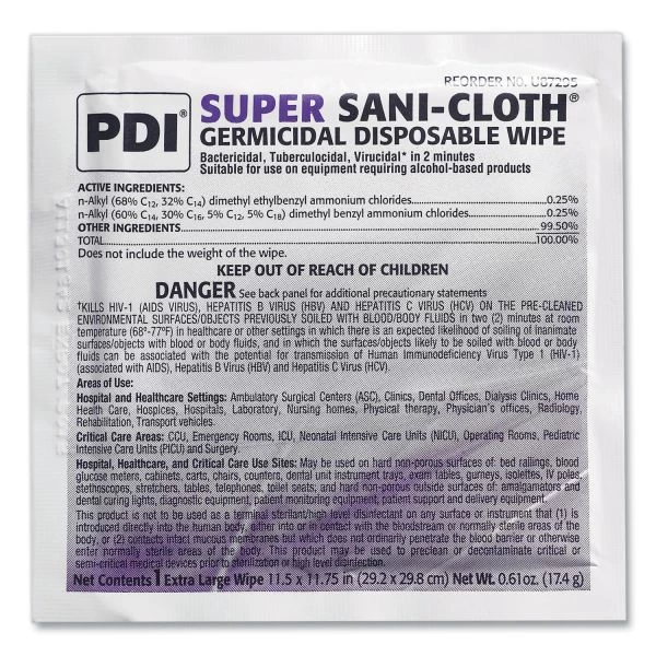 Sani Professional Super Sani-Cloth Individually Wrapped Germicidal Disposable Wipes, Extra-Large, 1-Ply, 11.5 x 11.75, White, 50/Box,3 Boxes/CT – Super Sani-Cloth germicidal disposable wipes are proven effective against enveloped and non-enveloped viruses, fungi, bacteria, multidrug-resistant bacteria and blood-borne pathogens—32 microorganisms in all, including SARS-CoV-2. A fast contact time of just two minutes accommodates quick room turnovers, making them ideal for daily use in fast-paced environments that require short contact times and broad microorganism coverage. Thick and strong with a high fluid capacity, each wipe is also pliable enough to get into tight crevices and corners. Safe for use on a broad range of health-care equipment and most hard, nonporous surfaces. Active ingredient: isopropyl alcohol 55.5%.