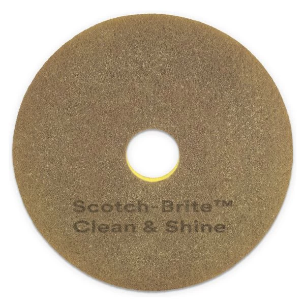 Scotch-Brite Clean and Shine Pad, 20″ Diameter, Brown/Yellow, 5/Carton – Cleans and shines in the same step, using only a low-speed scrubber. Save costs and labor by reducing or eliminating the need to burnish. Removes black marks three times faster than traditional cleaning pads. Two-sided pad lasts longer than traditional cleaning pads. Effective on most coated and uncoated hard floors including VCT, vinyl, rubber, marble, stone, terrazzo, granite and concrete with only water or neutral cleaner.