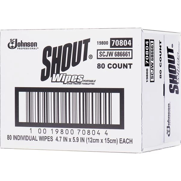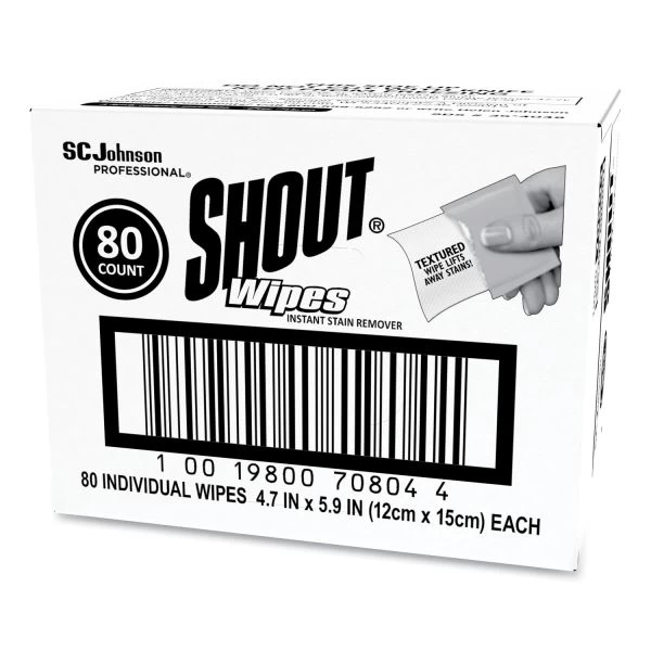 Shout Wipe and Go Instant Stain Remover, 4.7 x 5.9, Unscented, White, 80 Packets/Carton – Wipes provide convenient, portable, instant stain treatment and removal. They are ideal for clothing, carpet and auto interiors. Special stain-fighting ingredients instantly reduce the visibility of the stain. Each wipe keeps most stains from setting into clothes, eliminating many stains completely. Wipes are effective on grape juice, coffee, blood and other stains. Formula is safe on all colorfast washable and dry-cleanable fabrics. Instant stain remover wipes are individually wrapped.