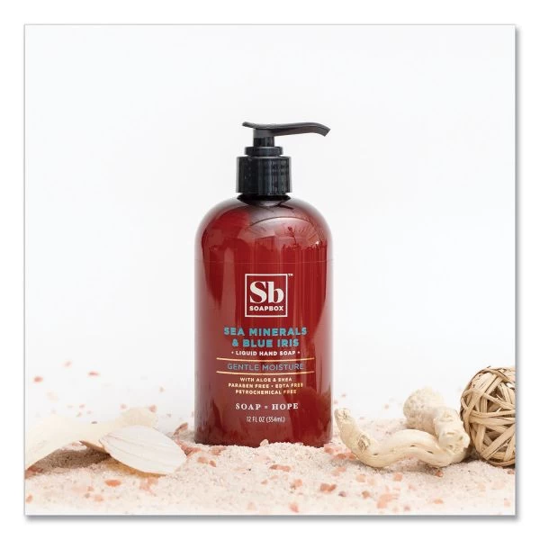 Soapbox Hand Soap, Sea Minerals and Blue Iris, 12 oz, 12/Carton – SOAP = HOPE. Change the world — choose a soap that matters. With each purchase, a bar of soap is provided to someone in need either locally or abroad. Made with thoughtfully selected, naturally derived ingredients and offer unique, soothing aromas to calm your body and mind. Removing daily grime from your hands is a must for hand soap, but that shouldn’t mean stripping away moisture. Infused with hydrating shea butter and aloe vera that will leave your hard-working hands feeling clean and nourished with every wash. Vegan soap is cruelty-free, gluten-free and free of harsh chemicals and parabens.